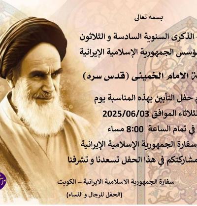 یقام حفل تأبین بمناسبة الذکری السنویة لرحیل مؤسس الجمهوریة الاسلامیة الایرانیة فی مبنی السفارة یوم الثلاثاء الموافق 2025/06/03. حضورکم فی هذا الحفل تسعدنا و تشرفنا.
