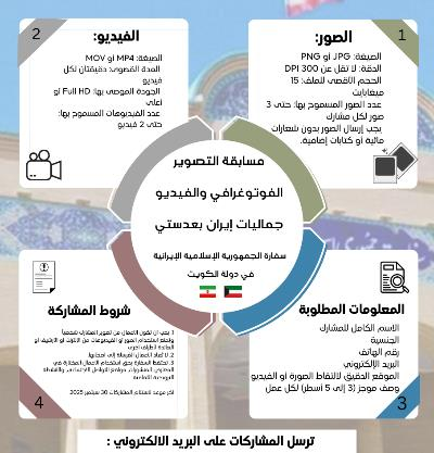تدعو سفارة الجمهورية الإسلامية الإيرانية في دولة الكويت المواطنين الكويتيين والمقيمين من الجنسيات الأخرى ممن سبق لهم زيارة إيران، إلى المشاركة في هذه المسابقة من خلال إرسال صورهم ومقاطع الفيديو الخاصة بهم و التي توثق الجوانب الجمالية والمعالم السياحية في إيران، مرفقةً بالاسم الكامل، ورقم الهاتف، واسم الموقع المصوَّر، إلى البريد الإلكتروني التالي : Iranemb.kwi@mfa.gov.ir سيتم منح جوائز قيّمة لأفضل الأعمال، كما سیُقام لاحقاً معرض لأبرز الصور والمقاطع المشاركة. المواصفات الفنية للأعمال للصور: الصيغة: JPG أو PNG الدقة: لا تقل عن 300 DPI الحجم الأقصى للملف: 15 ميغابايت عدد الصور المسموح بها: حتى 3 صور لكل مشارك يجب إرسال الصور بدون شعارات مائية أو كتابات إضافية. للفيديوهات: الصيغة: MP4 أو MOV المدة القصوى: دقيقتان لكل فيديو الجودة الموصى بها: Full HD أو أعلى عدد الفيديوهات المسموح بها: حتى 2 فيديو المعلومات المطلوبة مع كل مشاركة الاسم الكامل للمشارك/ الجنسية /رقم الهاتف /البريد الإلكتروني /الموقع الدقيق لالتقاط الصورة أو الفيديو /وصف موجز (3 إلى 5 أسطر) لكل عمل شروط عامة للمشاركة يجب أن تكون الأعمال من تصوير المشارك شخصياً، ويُمنع استخدام الصور أو الفيديوهات من الإنترنت أو الأرشيف أو العائدة لأطراف أخرى. لا تُعاد الأعمال المُرسلة إلى أصحابها. تحتفظ السفارة بحق استخدام الأعمال المختارة في المعارض، المنشورات، مواقع التواصل الاجتماعي، والأنشطة الترويجية الثقافية. ملاحظة: آخر موعد لاستلام المشاركات 30 سبتمبر 2025