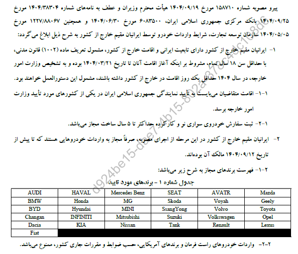 پیرو ابلاغ تصویب نامه شماره : 158710/ت 65125هـ مورخ : 19 / 09 / 1404 هیأت محترم وزیران و به استناد مکاتبه شماره : 6820667 مورخ : 26 / 09 / 1404 وزارت صنعت ، معدن و تجارت ، شرایط واردات خودرو ایرانیان خارج از کشور جهت آغاز پروژه ثبت درخواست های واردات خودرو توسط جامعه هدف، به شرح زیر ابلاغ میگردد :