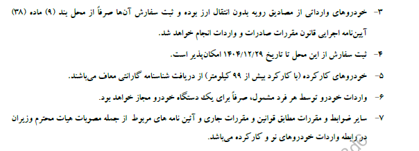 - سایر ضوابط و مقررات مطابق قوانین و مقررات جاری و آئین نامههای مربوط ، از جمله مصوبات هیأت محترم وزیران در رابطه با واردات خودروهای نو و کارکرده میباشد .